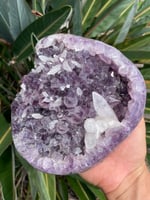 High grade Amethyst with polished edges and UV reactive dog tooth Calcite that glows from Brazil. Photo has been taken with the Lumenshooter 365nm UV flashlight.