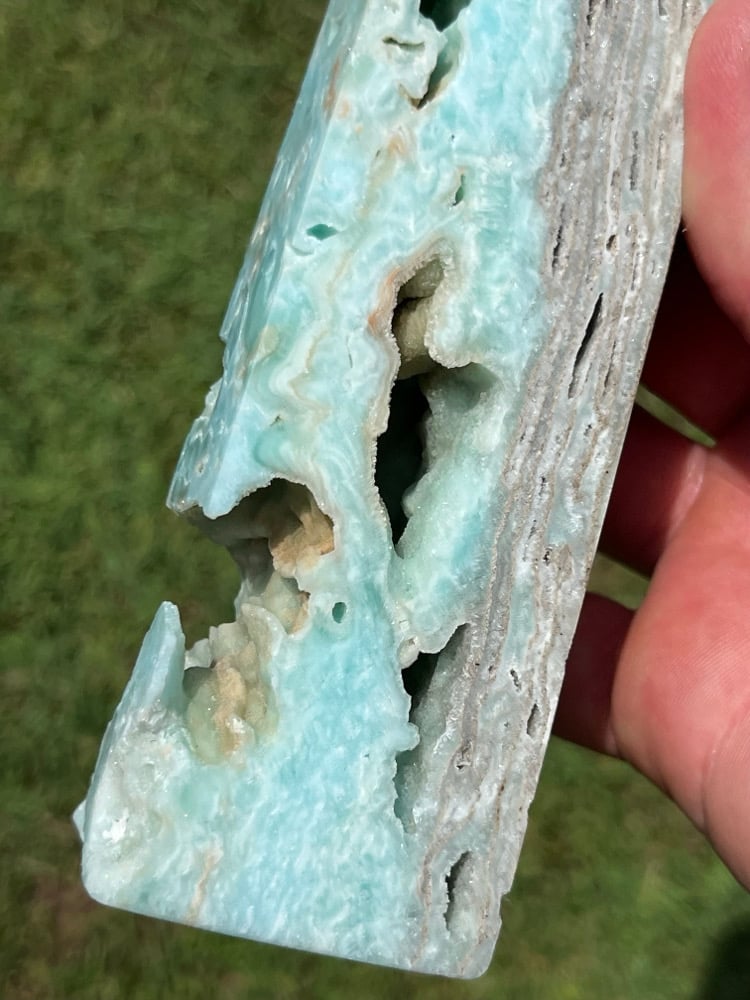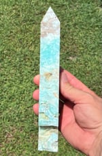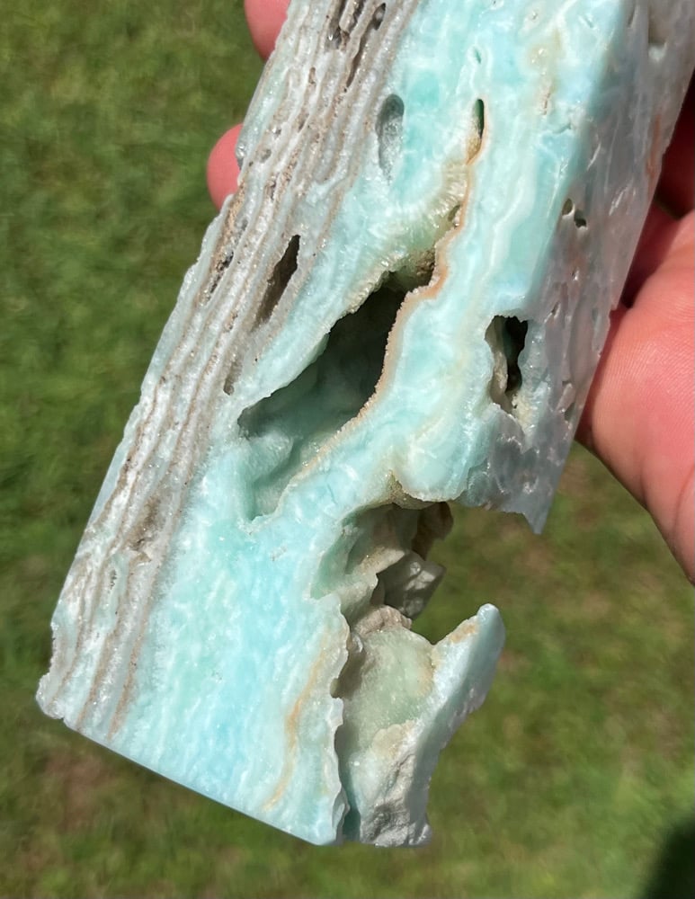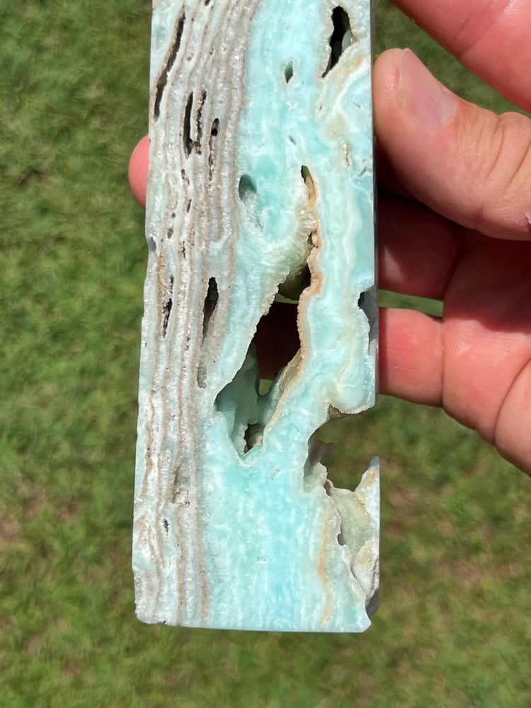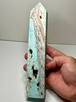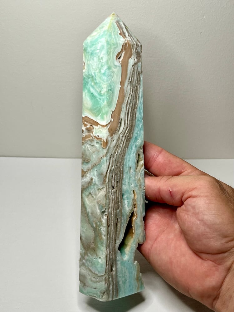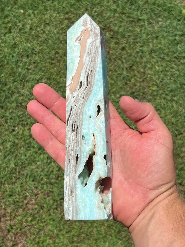 Blue Aragonite 4 sided Tower with natural cavities.