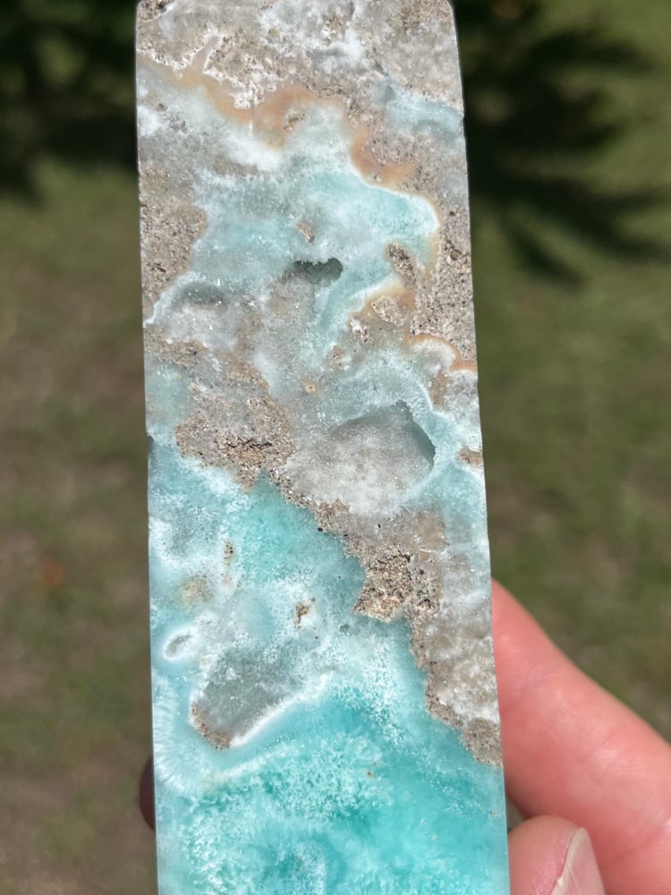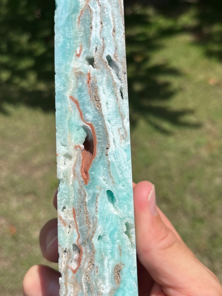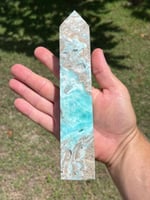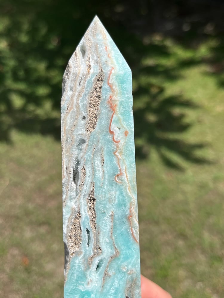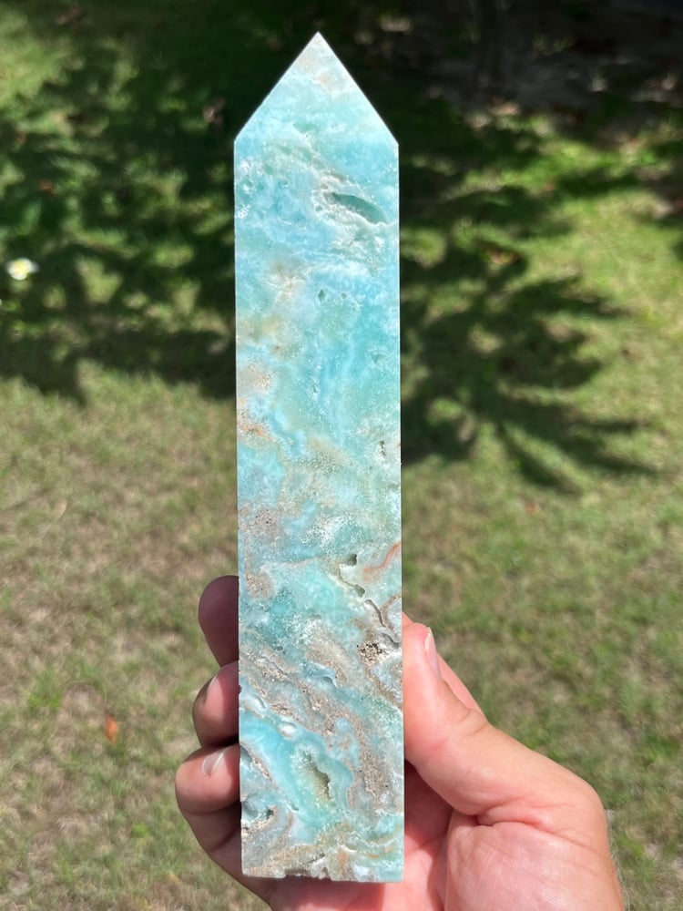 Blue Aragonite 4 sided Tower with natural cavities.