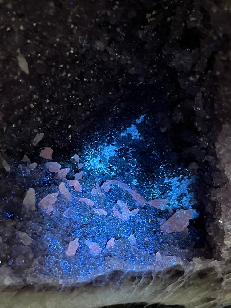 This one of a kind Brazilian druzy amethyst crystal cave is truly a statement piece for any home or collector who wants something different featuring thousands of tiny little crystals & UV calcite points it's an amazing cave.