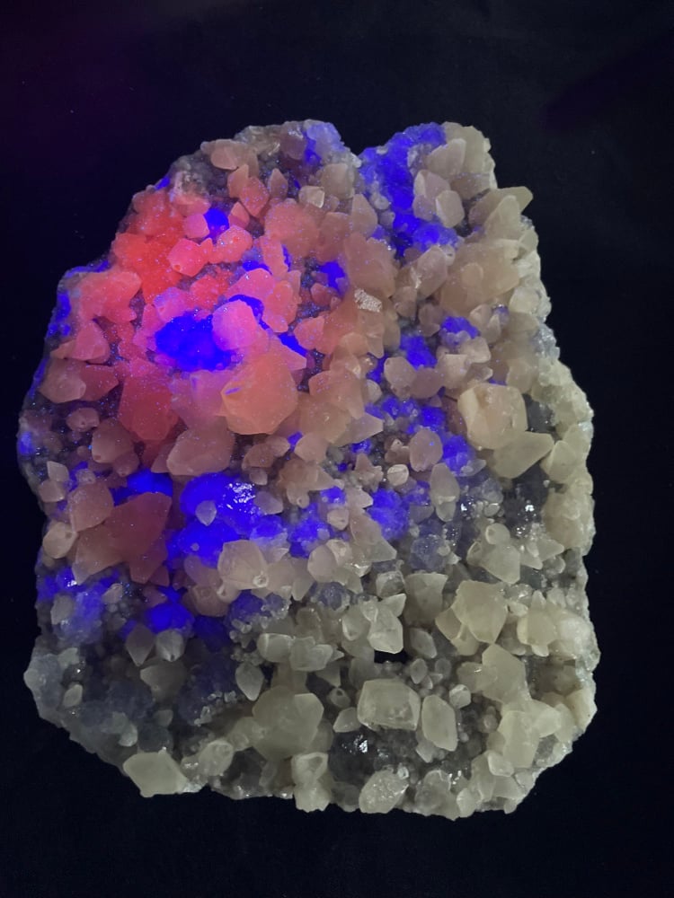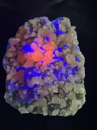 Double sided Green Fluorite on Druzy Quartz with UV reactive dog tooth Calcite that glows under UV light. Photo has been taken with the Lumenshooter 365nm UV flashlight.