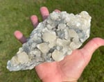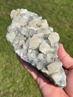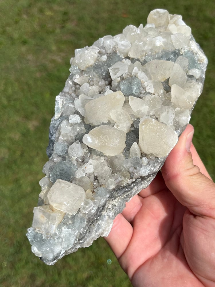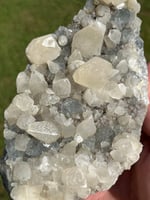 Green Fluorite on Druzy Quartz with UV reactive dog tooth Calcite that glows under UV light.