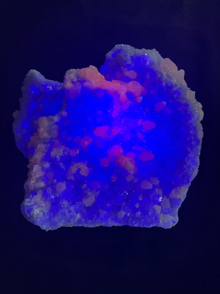 Double sided Green Fluorite and UV reactive Calcite specimen self standing piece glows under UV light. Photo has been taken with the Lumenshooter 365nm UV flashlight.