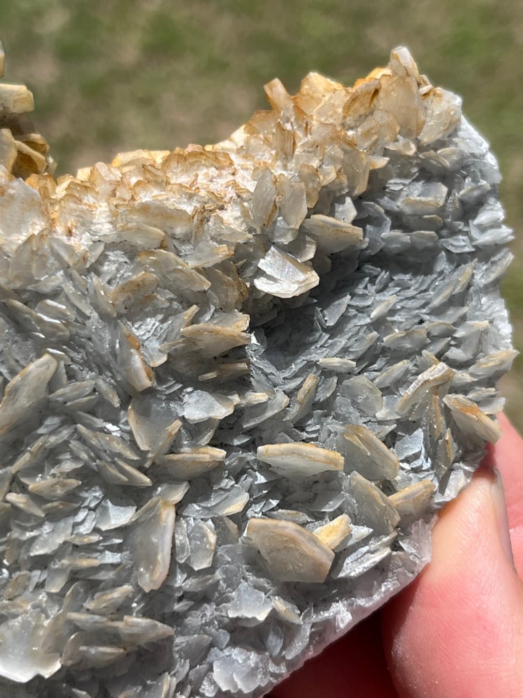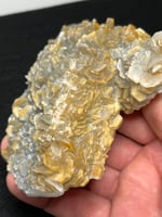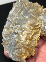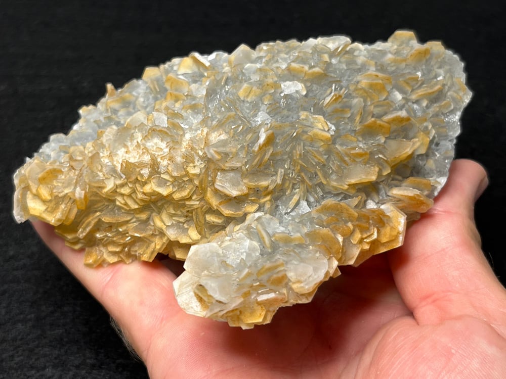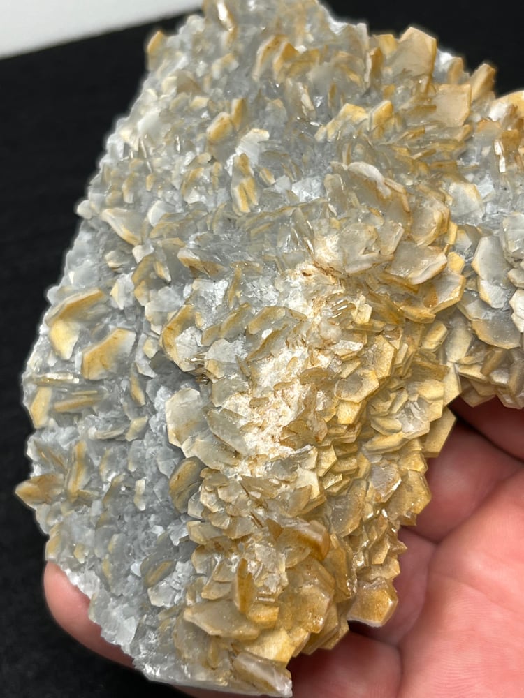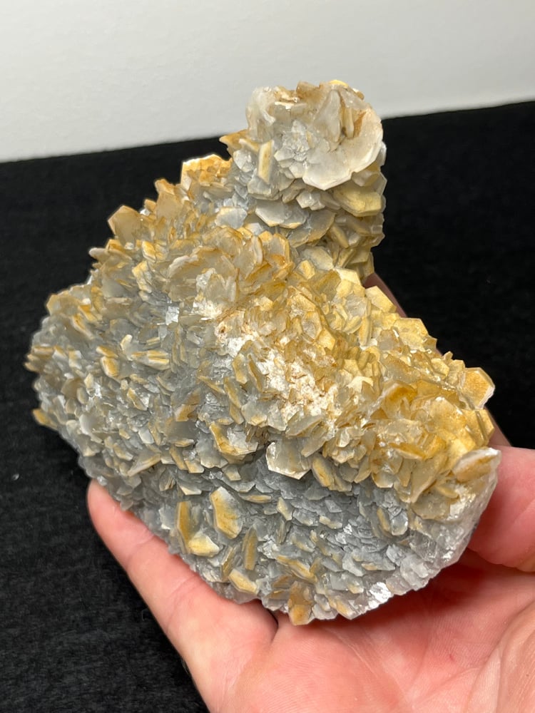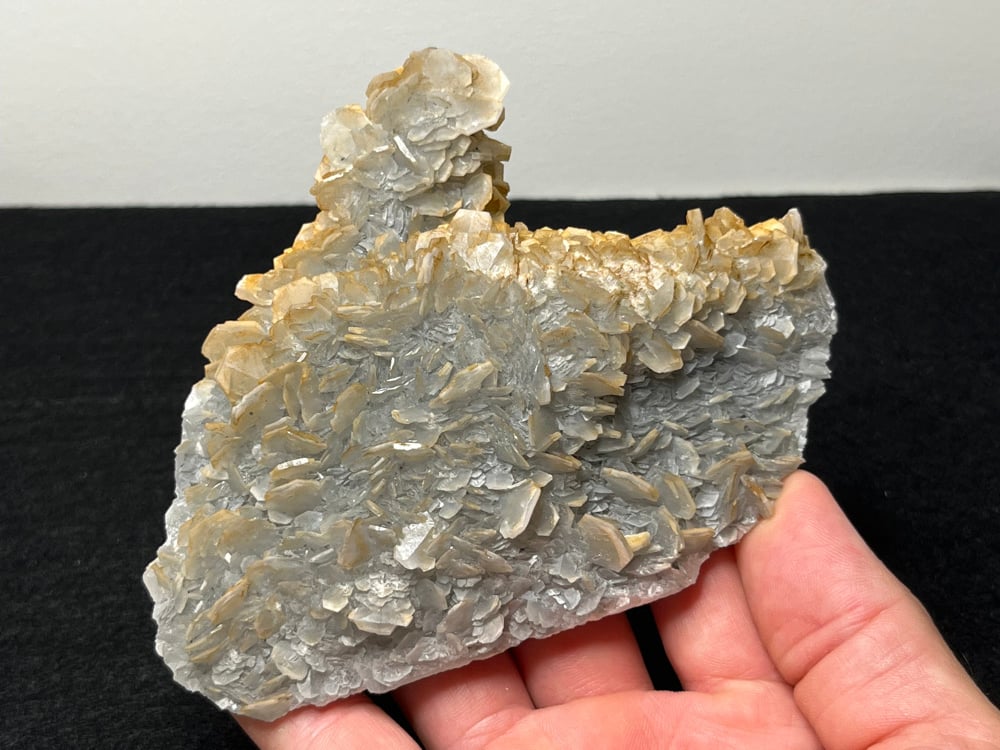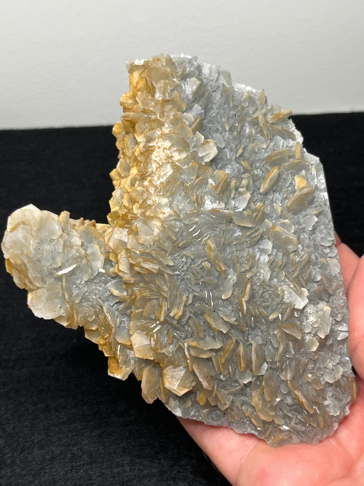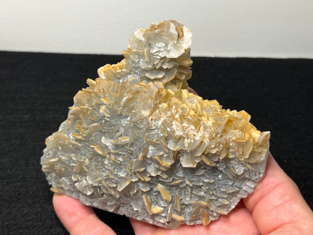 Hunan Calcite cluster Specimen with tightly packed, bladed calcite crystals in soft honey-tan to light grey tones. From the Hunan Province, China.