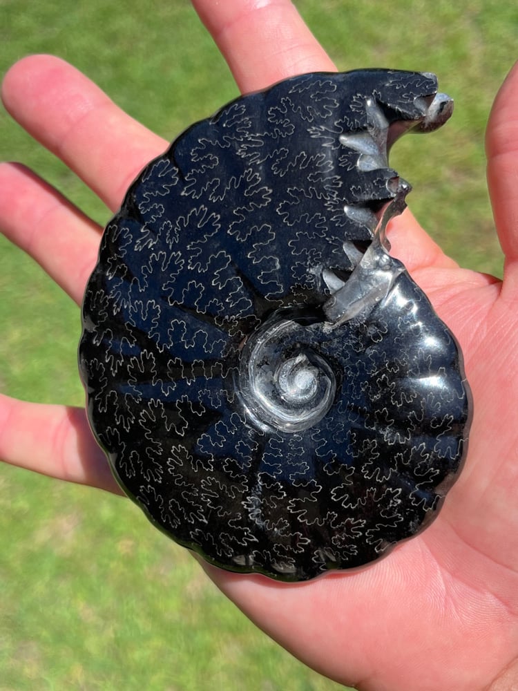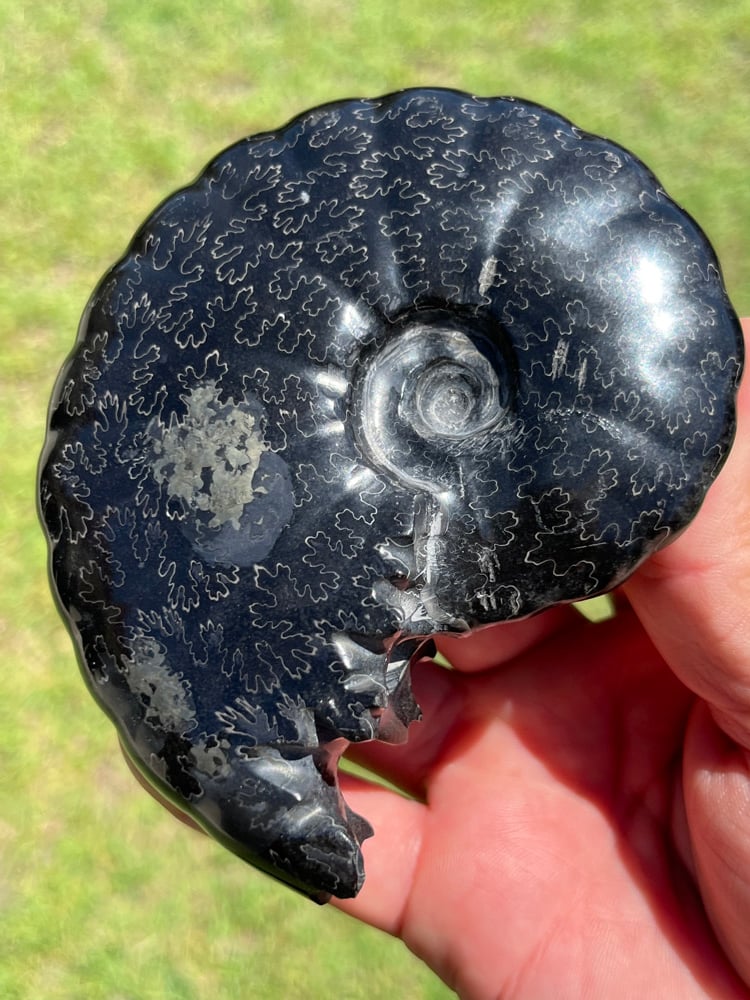 Ammonite fossil with natural black carbon-rich patterns and golden pyrite inclusions that has formed over millions of years.