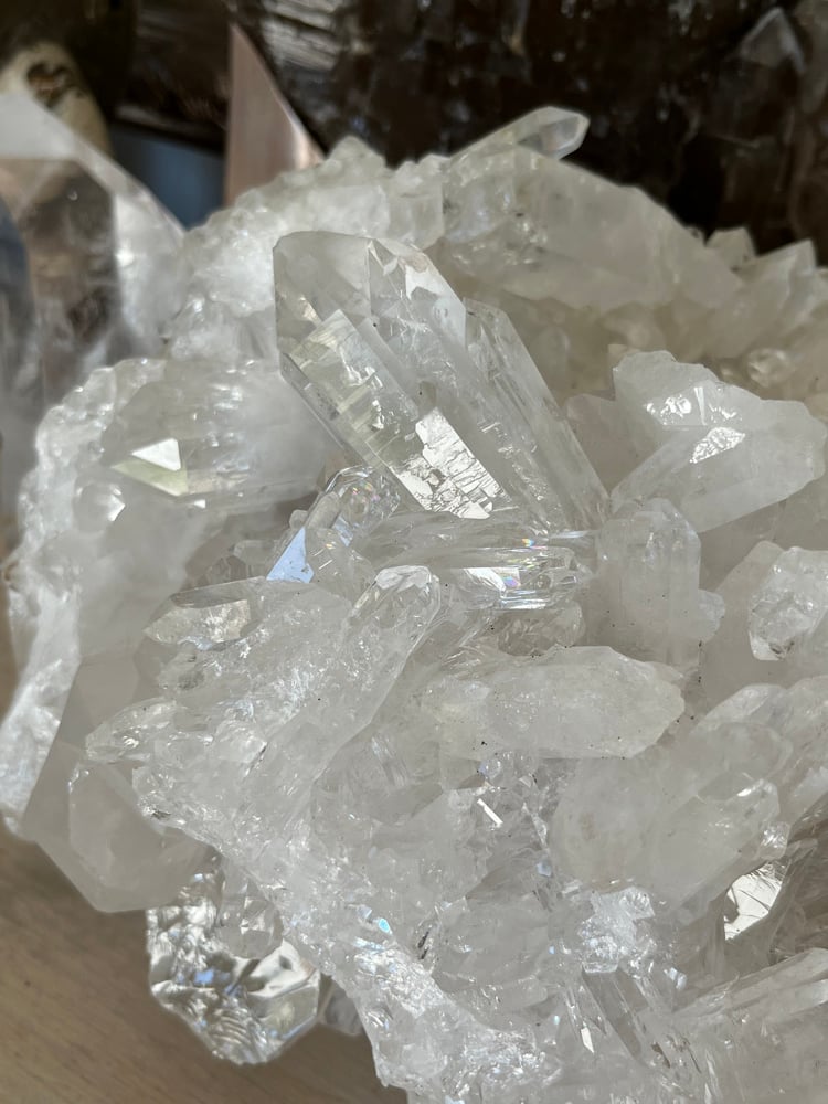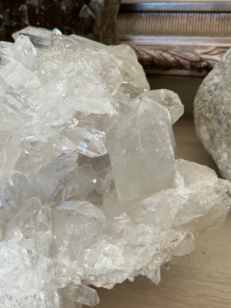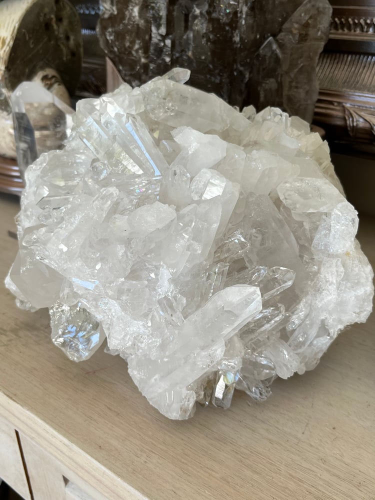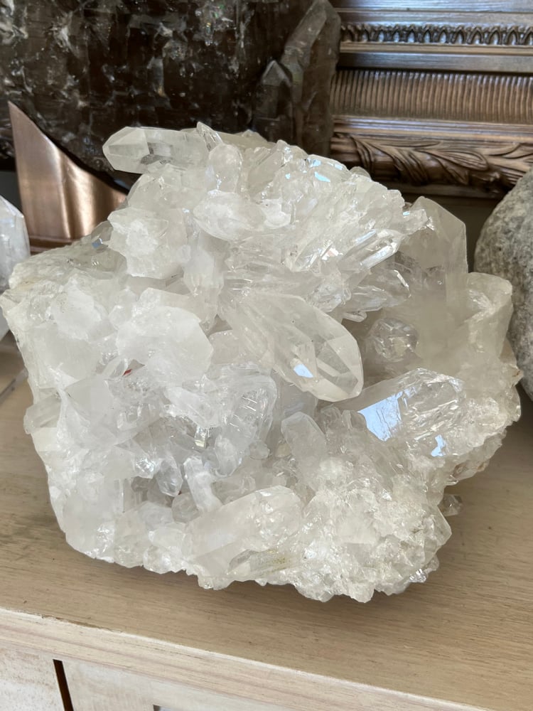 Large A grade Natural Clear Quartz points cluster statement piece can be displayed a number of different ways.