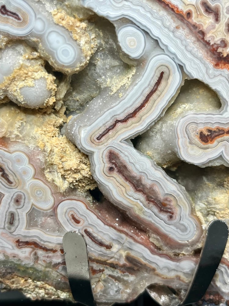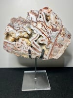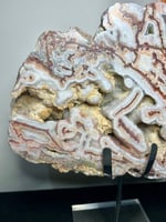Polished Mexican Lace Agate specimen featuring beautiful flowing patterned banding and natural druzy cavities. Displayed on a custom stand.