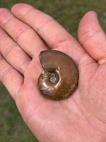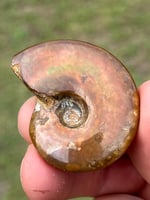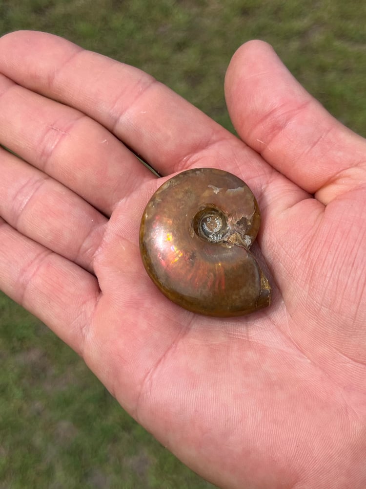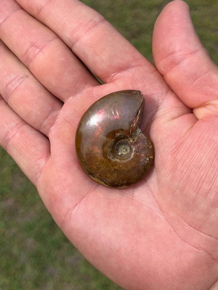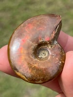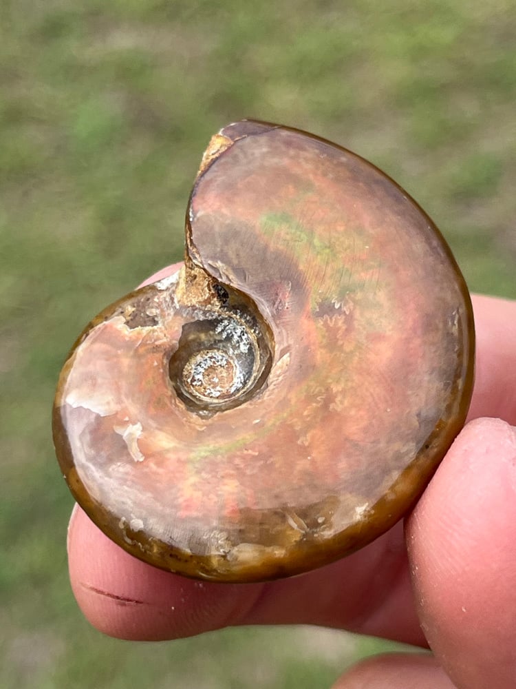 Rainbow Iridescent Ammonite shell fossil with a touch of the more uncommon Violet Purple colour when held in the right light.