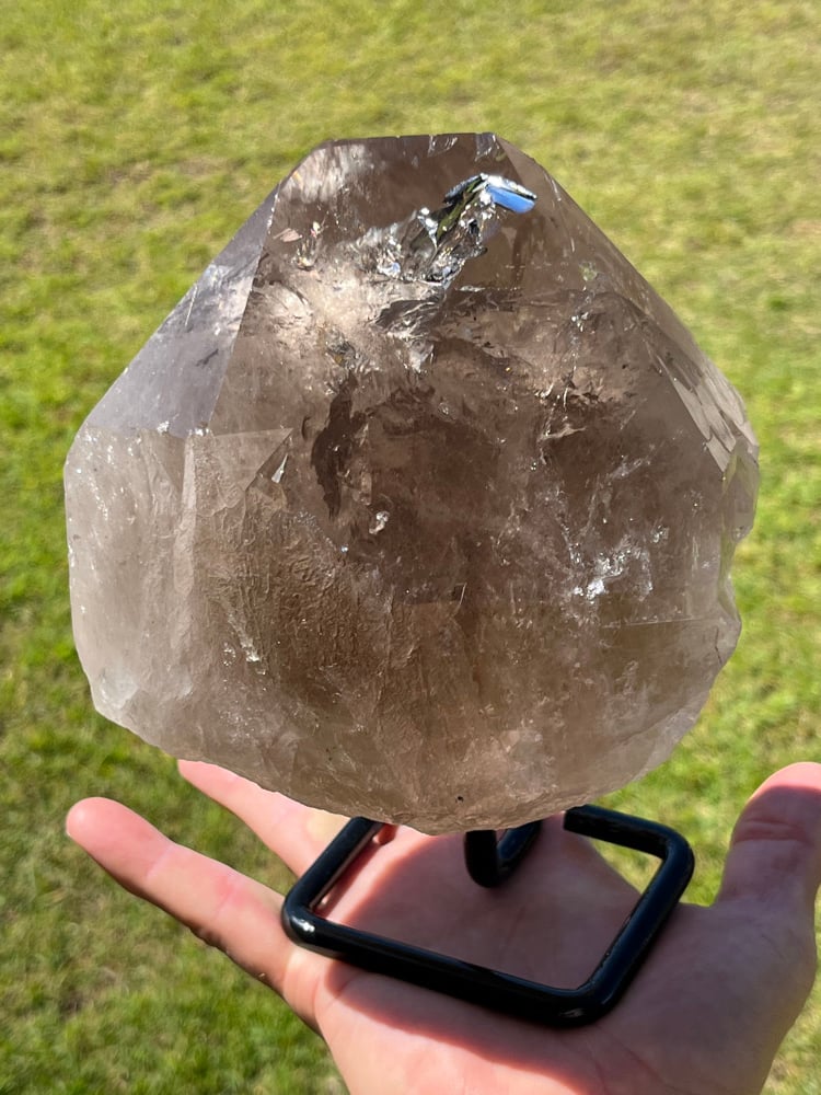 High grade Brazilian Smoky Quartz Crystal point with amazing rainbows throughout on black custom display stand.