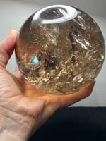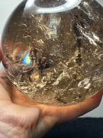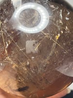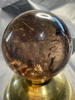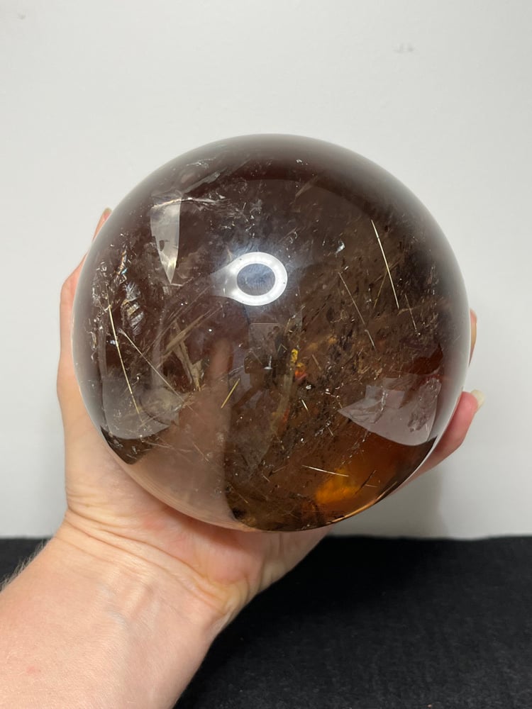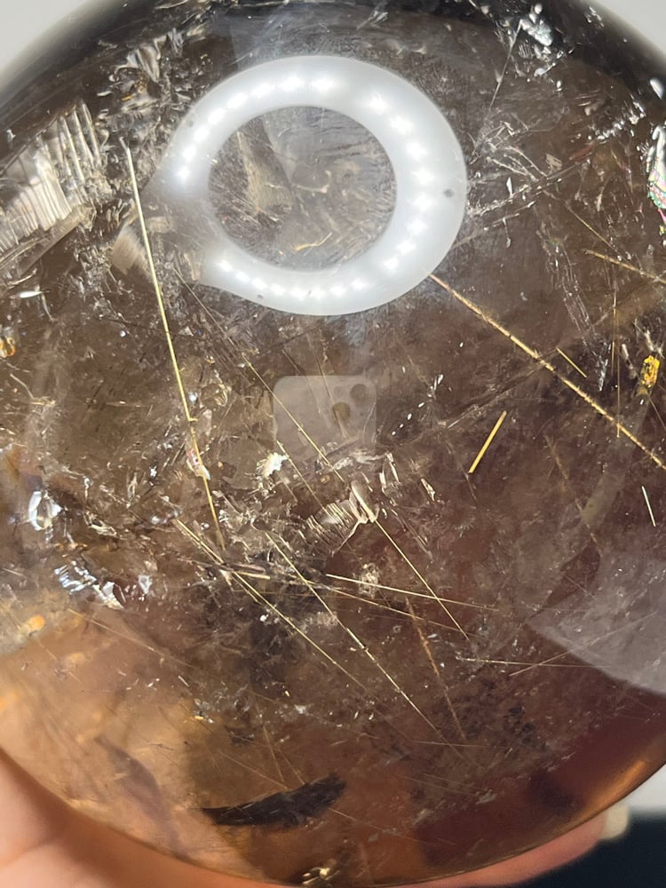 Large A grade Smoky Quartz sphere with Golden needle like Rutile & amazing rainbows throughout.