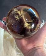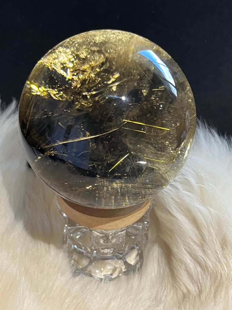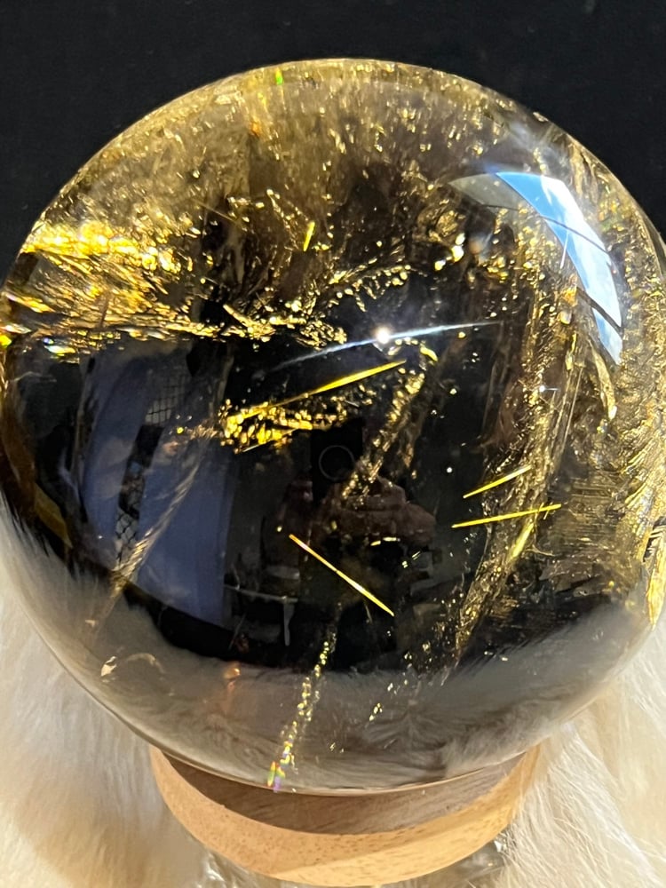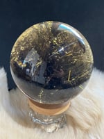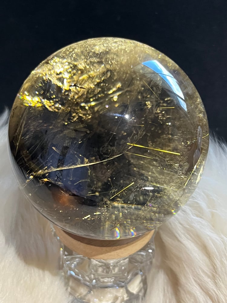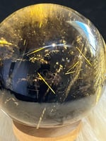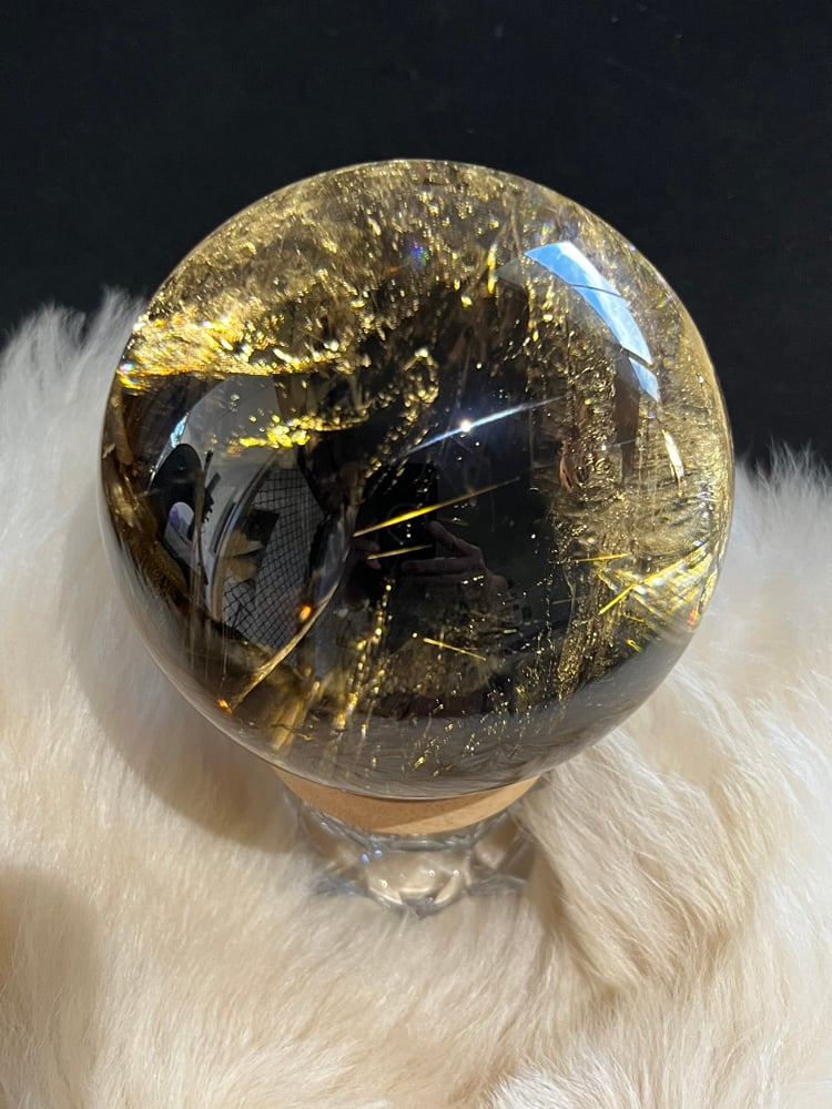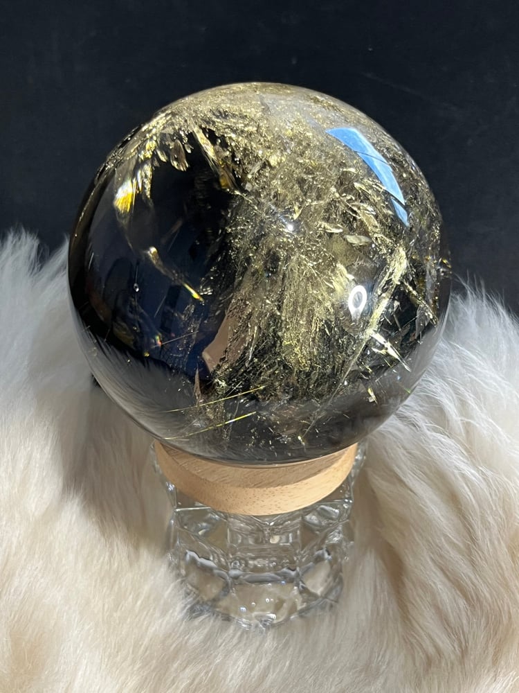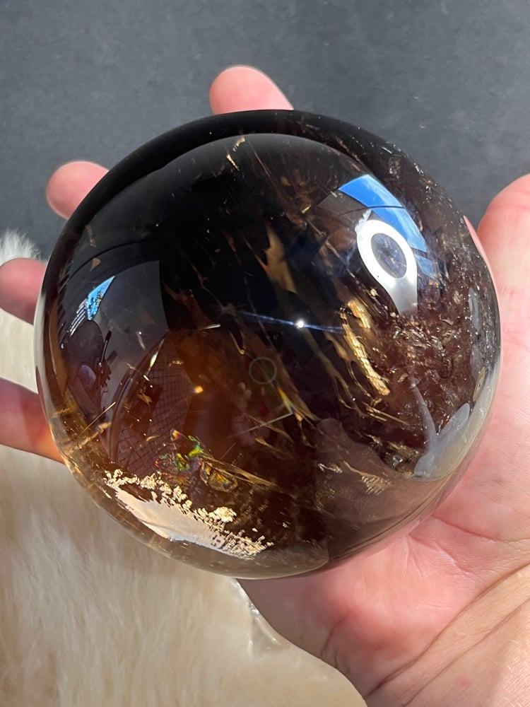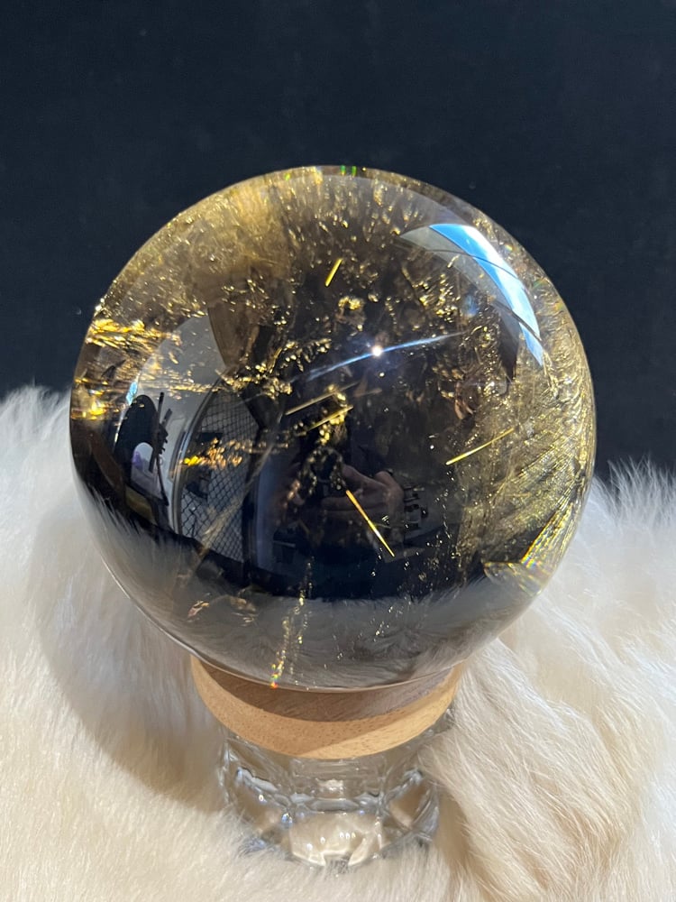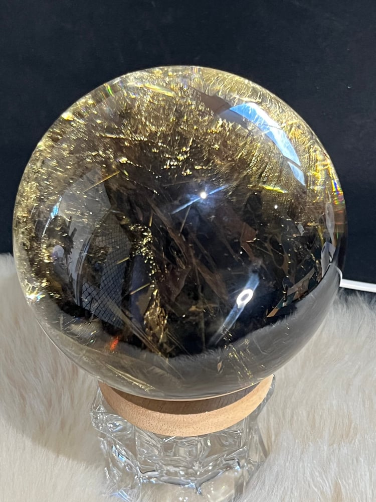 Large A grade Smoky Quartz sphere with Golden needle like Rutile & amazing Rainbows throughout.