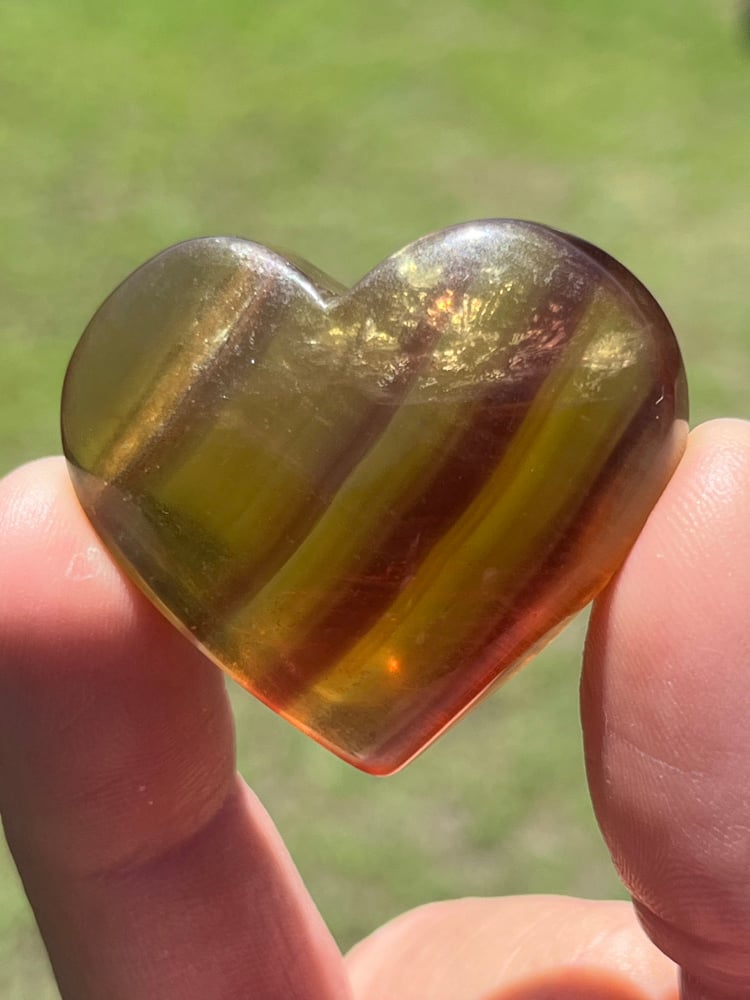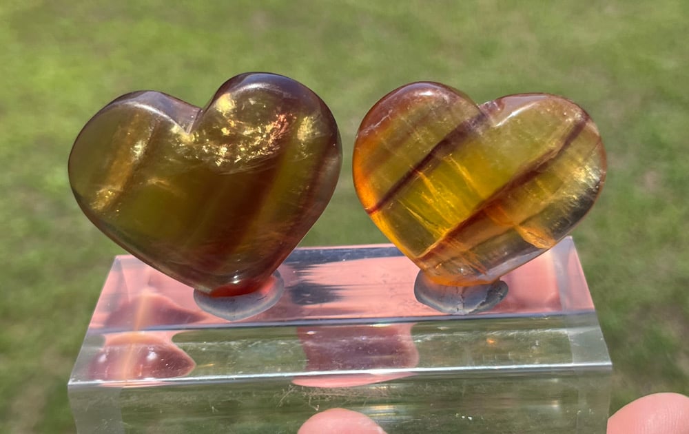 Pair of carved Yellow Fluorite hearts with bright golden tones and nice translucency.